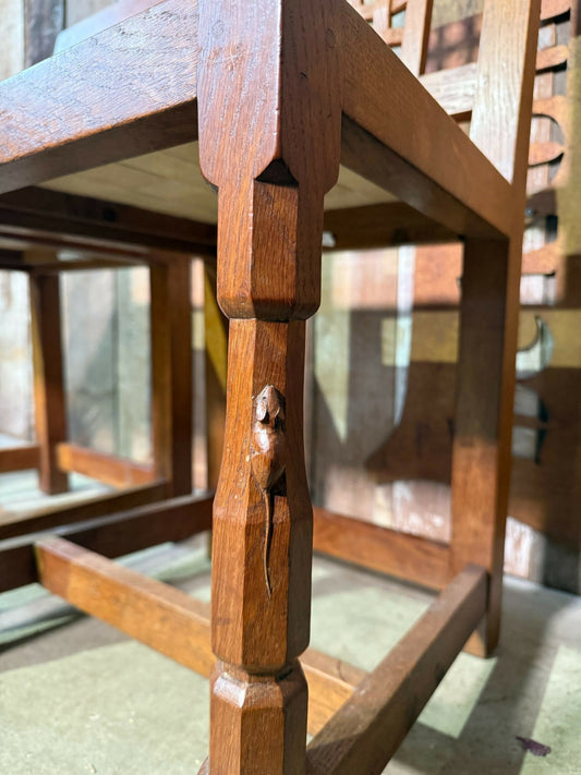 Vintage Pair Oak Robert “Mouseman” Thompson Lattice Back Leather Dining Chairs