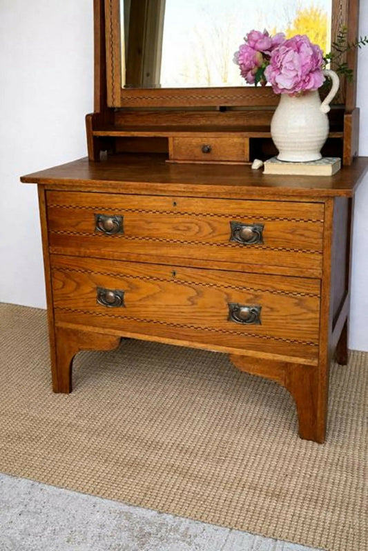 Antique Oak Dressing Table With Inlaid Mirror, Chest Of Drawers, Hall Console, Bedroom Furniture, Living Room, Country Style, Cottage Decor
