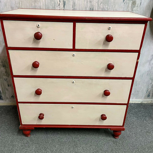 Large Victorian Chest 2 Over 3 Drawers Painted Salmon & Red Ornate Ball Feet