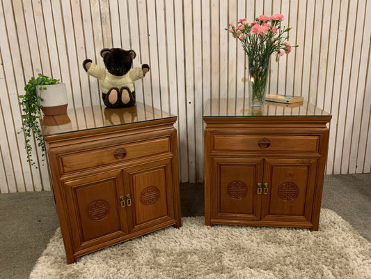 Two End Table/ bedside Carved Chinese with 1 drawer ,2 door and a glass top