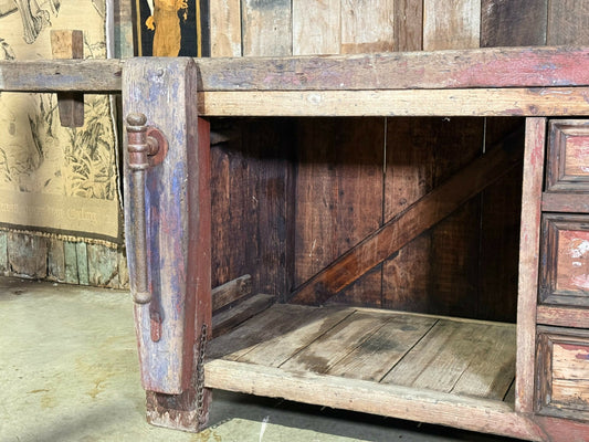 Antique Edwardian Pine Workbench Kitchen Island Bench with Cupboard & Drawers, c.1920