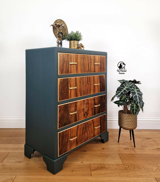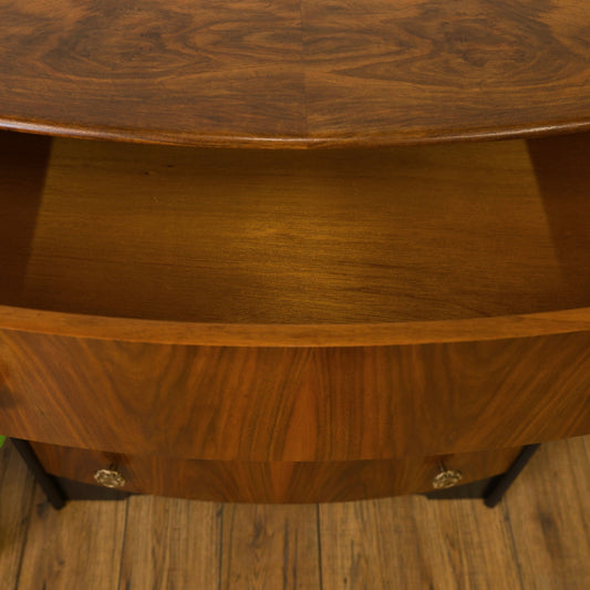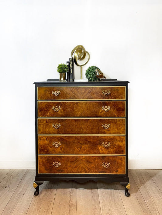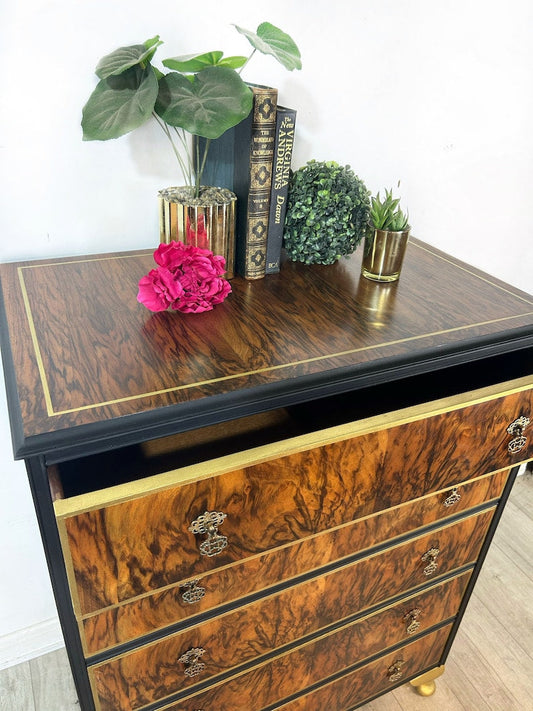 Vintage Walnut & Black Bow Front Chest of Drawers – Art Deco Upcycled Furniture with Gold Handles