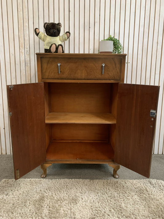 Vintage Art Deco burr walnut veneer cupboard featuring two doors and one drawer.