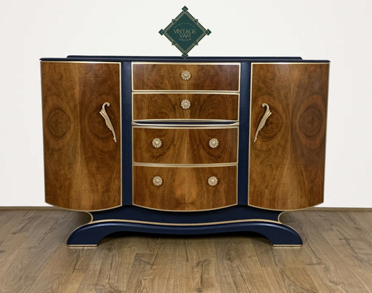 Art deco style Sideboard/Buffet. Palmer House Hotel Tiffany Peacocks. Navy Blue and Gold