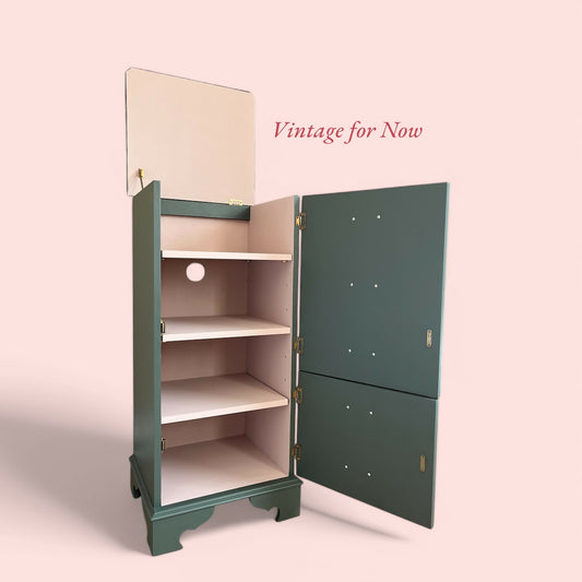 Available: Exquisite Art Deco drinks cabinet decoupaged in a striking dusty pink crane fabric.