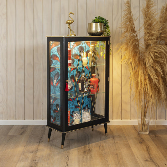 Available: Midcentury drinks cabinet, distinguished by its unique diamond frontage and decoupage African peacock feather fabric.