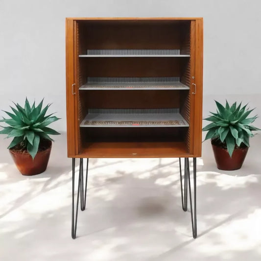1960s Teak Drinks Cabinet With Metal Shelving Sliding Tambour Doors FREE UK Delivery