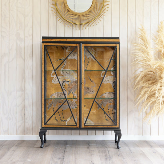 Exquisite Art Deco drinks cabinet decoupaged in a striking blend of emerald, subtle gold and black crane fabric. Sold, commission available.