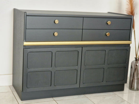 Nathan MCM sideboard, mid century, vintage, drink cabinet, media unit, black, ash, gold