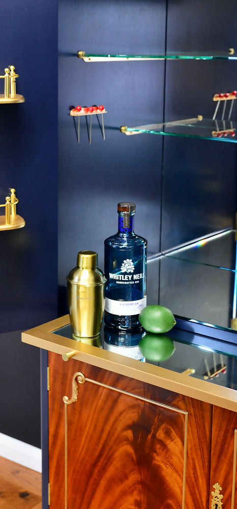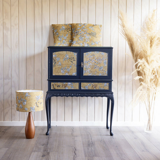 Mahogany Drinks Cabinet in Navy Blue and gold.