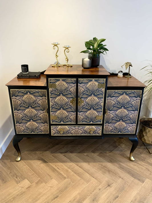 Blue mid century sideboard with an integrated cocktail bar, featuring a captivating blend of midnight blue and oriental fabric. Sold, commission available.