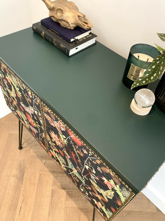 An exceptional vintage sideboard in a unique olive green hue, featuring an oval mirror and decoupaged in original Rockbird fabric. Sold: Commission Available.