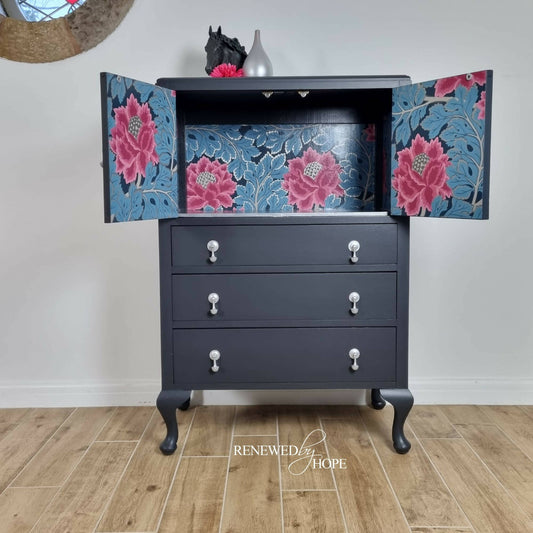 Off Black Oak Tallboy, drinks cabinet, linen cupboard, storage, Tall Cupboard with Drawers, upcycled, Cole & Son wallpaper