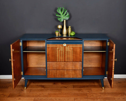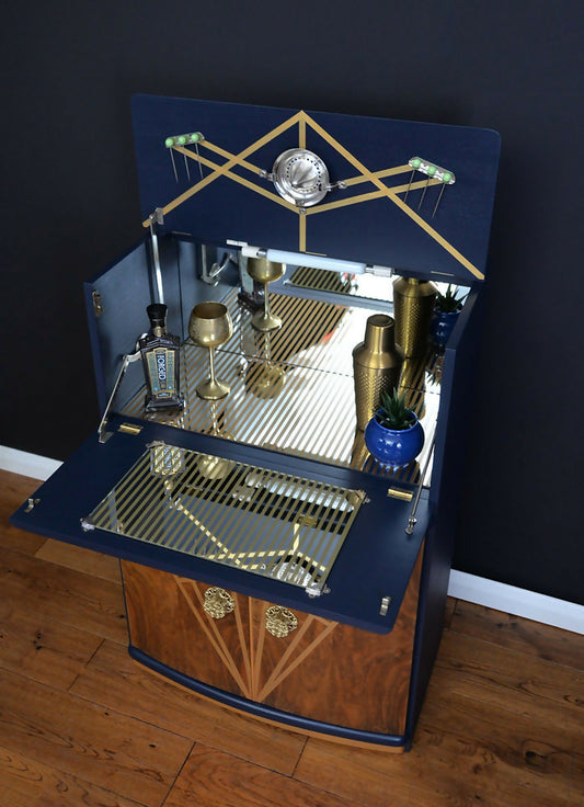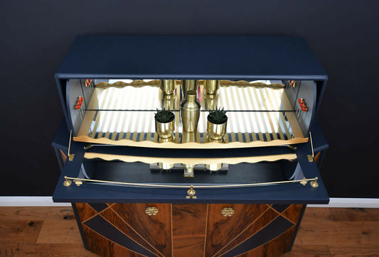 Mahogany Drinks Cabinet in Navy Blue and gold.