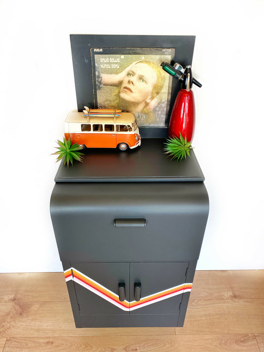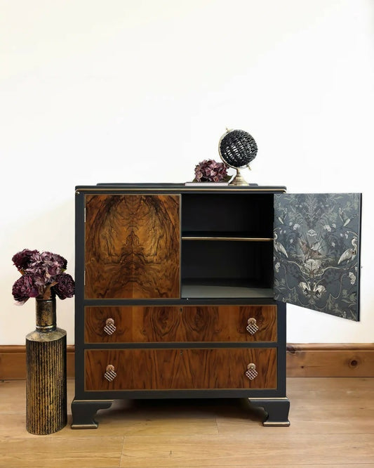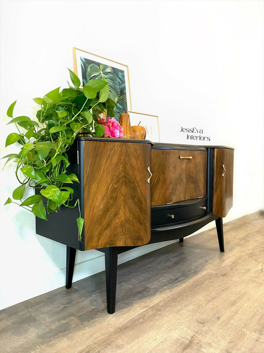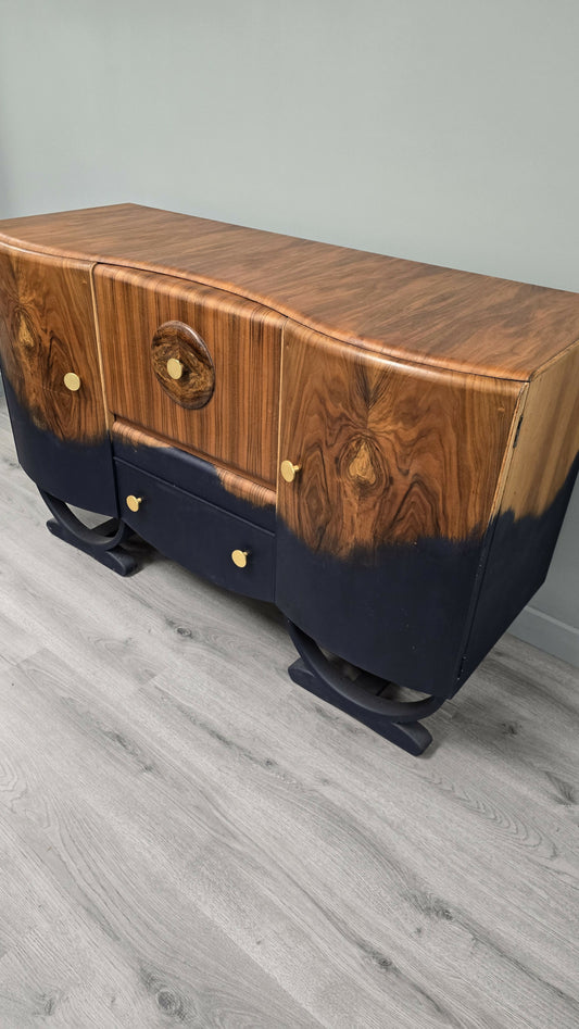 Vintage Upcycled Stonehill Art Deco style sideboard, black and walnut drinks / cocktail cabinet