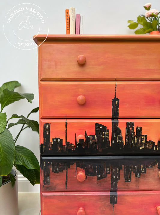 Sunset Ombre tallboy chest of drawers with hand painted NYC skyline