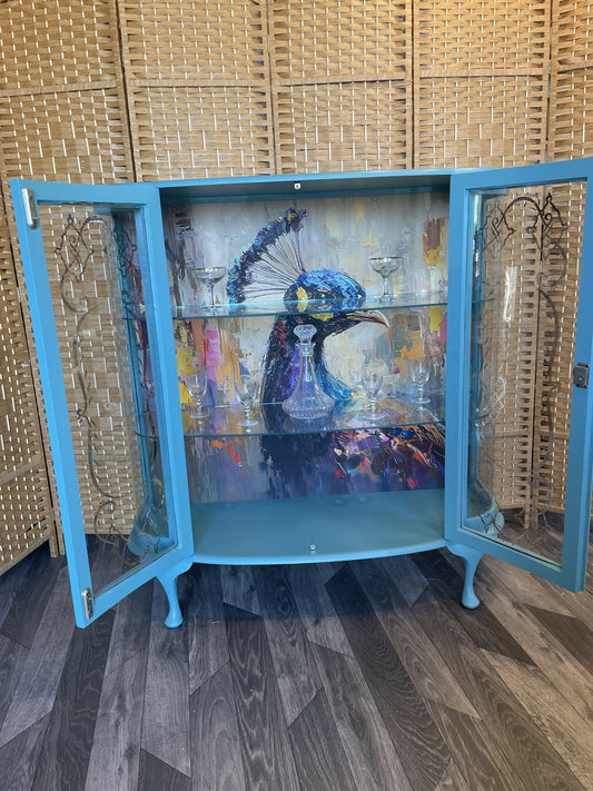 Mid 20th century handpainted bow fronted Display/China/Drinks cabinet on queen Anne legs. Patterned gold, grey diamond handpainted cabinet