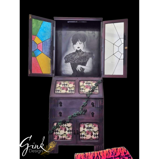 Wednesday Addams Gothic Writing Bureau – Dark Academia Desk with Stained Glass & Harlequin Floral Art