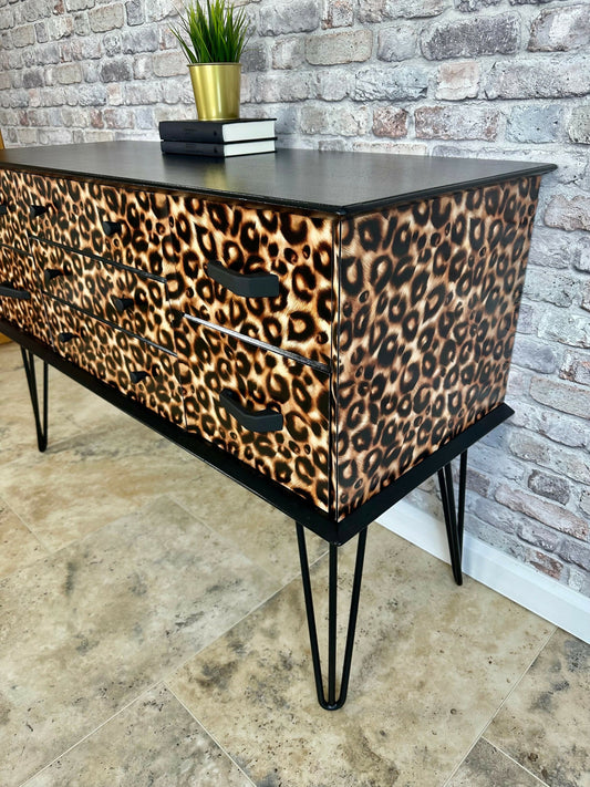 “Fierce Leopard Print Mid-Century Sideboard – Black & Pink Glam with Hairpin Legs”