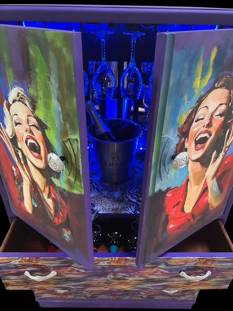 Retro Drinks Cabinet 1950's Pop Art Hand Painted Home Bar LED Lit
