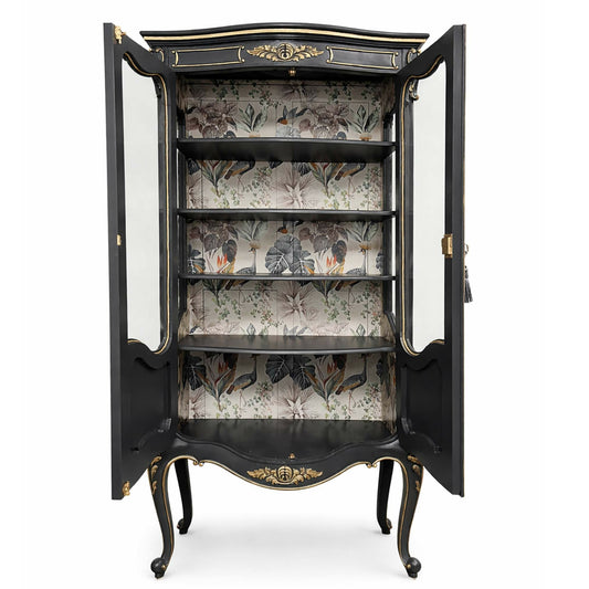 French-Style Black & Gold Glazed Display Cabinet Vitrine with Botanical Interior