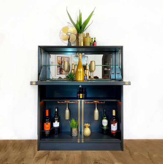 One of a kind blue vintage cocktail cabinet, vintage drinks cabinet, cocktail bar, desk and drinks cabinet combined. Sold, commission available.