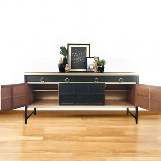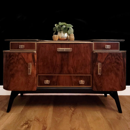 SOLD - CUSTOM ORDER Beautility Mid Century Cocktail Cabinet – A Stylish Statement For Entertaining / Walnut Grain / Black / Gold / Art Deco / Luxury Furniture