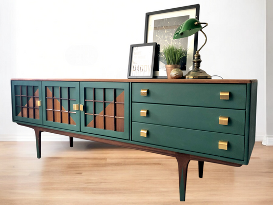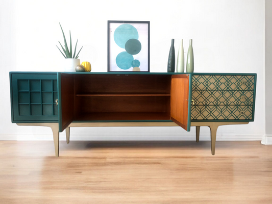 Made to Order Refurbished mid century modern Nathan large sideboard set, drinks cabinet, TV stand, media unit, sage green, decoupaged, cocktail, console