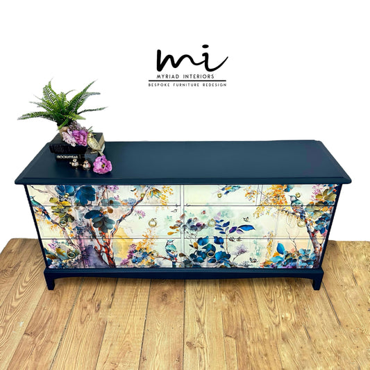 MADE TO ORDER Refurbished vintage Stag Minstrel large captains chest of drawers, navy blue, floral bird design, dresser, large sideboard mid century, teal