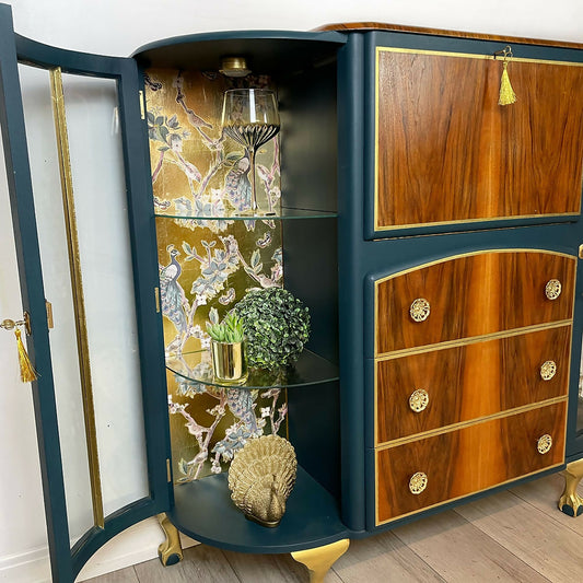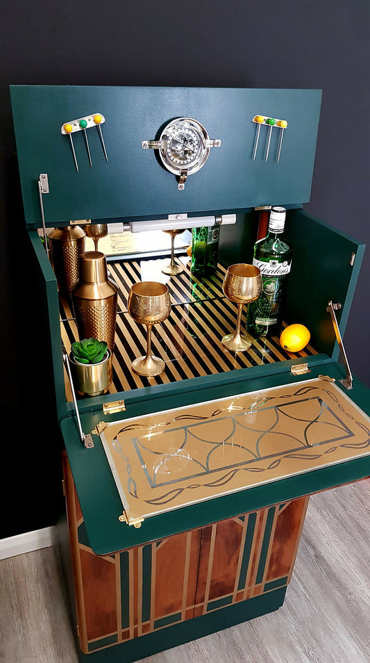 Art Deco Cocktail Cabinet, Teal Green Drinks Cabinet.