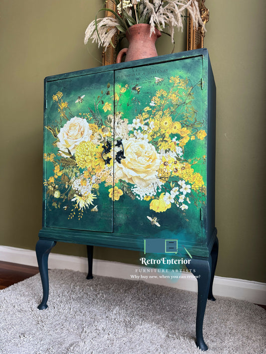 Upcycled Floral Cabinet – French-Inspired, Blue Green Yellow Painted Finish