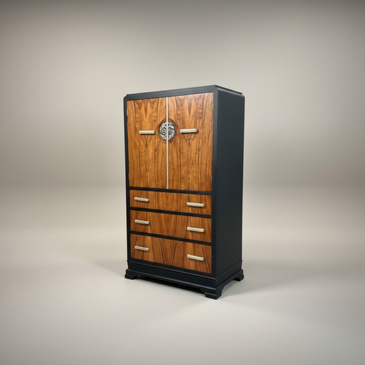 Gorgeous Vintage Tallboy Cabinet in Walnut Woodgrain and Florals (Drinks Cabinet/ Display/ Drawers/ Dresser/ Sideboard/ Art Deco)