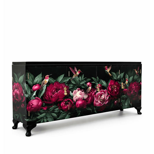 Vintage Slim Sideboard with Burgundy Peonies & Hummingbirds Made to order