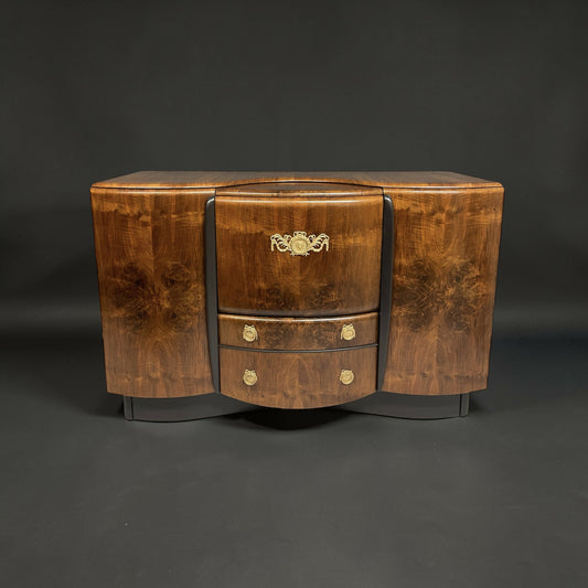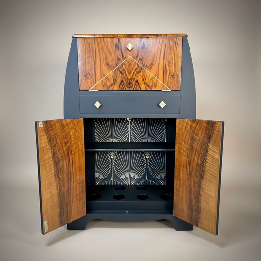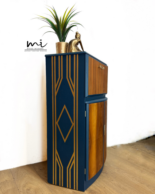 Navy Blue and Gold Art Deco Walnut Drinks Cabinet, cocktail cabinet, bar, sideboard, refurbished