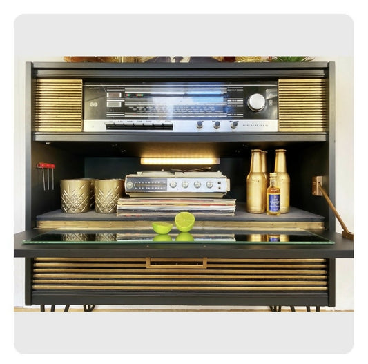 Cocktail Cabinet Conversion, Mid Century, Former Grundig Radiogram, Black And Bronze
