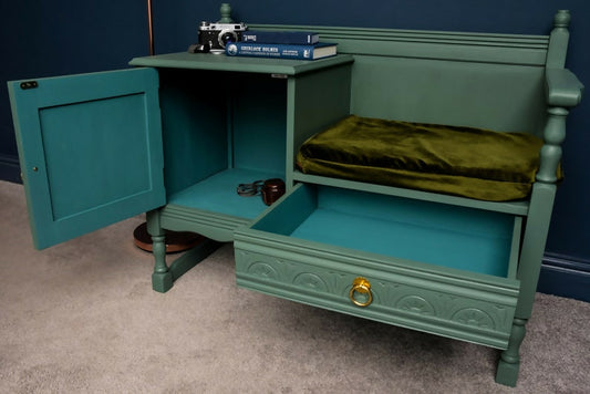 ****SOLD*****Solid Oak Gossip Bench - Green and Blue with cushion