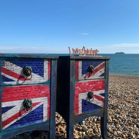 Pair Bedside Tables Union Jack Furniture Grungy Texturized Blue Bedside Cabinets Decoupaged Cabinets
