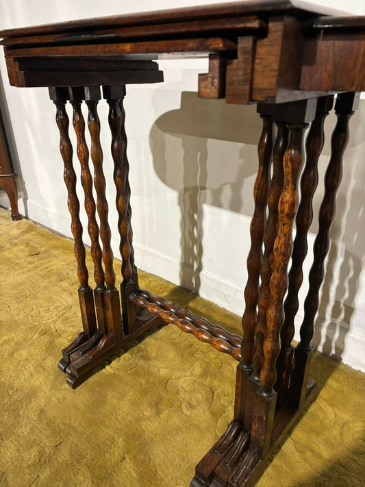 Regency rosewood nest of three tables, each with moulded oblong top and twin bobbin turned end supports