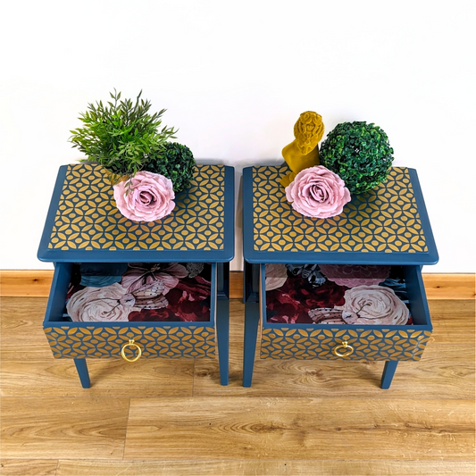 Pair of Stag Minstrel bedside cabinets, 'leggy' mid-century design with single drawers, painted in a teal blue with gold stencil detailing