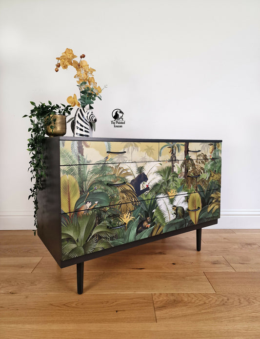 Black Mid-Century Modern MCM Stag Chest of Drawers with Jungle Decoupage
