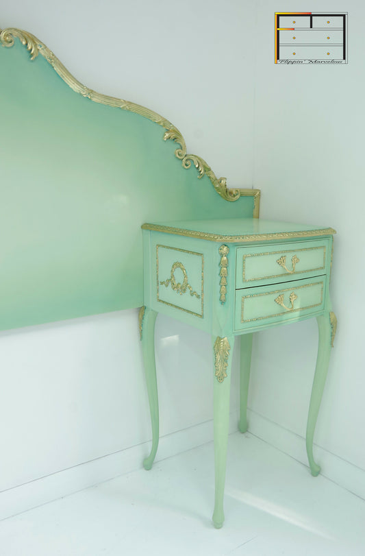 Green Olympus French Provincial Kingsize Headboard 2 Bedside Tables Refurbished Hand Painted Regency Renaisance Style Furniture