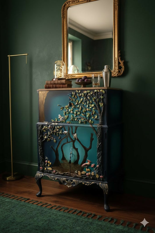 MADE TO ORDER - Cocktail Drinks Wine Gin Bar Artisan Cabinet "Enchanted Forest", Anthropologie Inspired, Handcarved Look