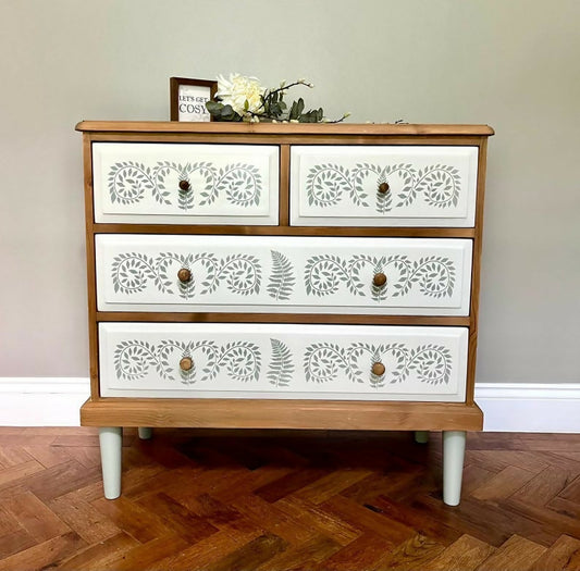 Refinished Stag Minstrel 4 over 2 chest of drawers in eucalyptus green with pretty floral design, dresser, dressing table pale sage, vintage