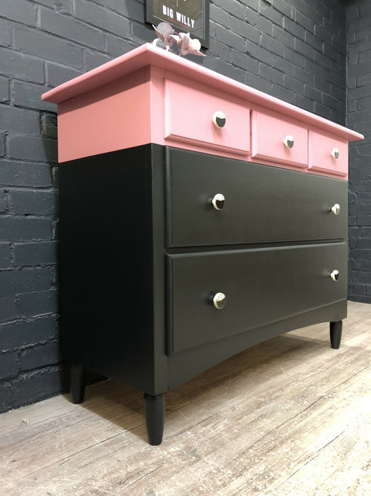 MADE TO ORDER: Upcycled chest of drawers in two-colour combination scheme, black and rasberry pink