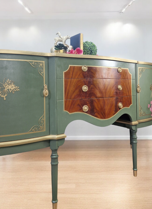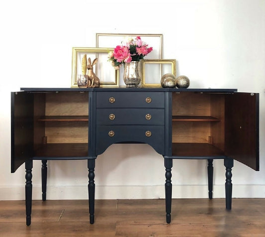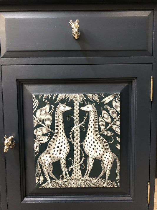 MADE TO ORDER: Upcycled sideboard/buffet with wallpaper fronts, drawers – Dark navy sideboard, Giraffe themed wallpaper