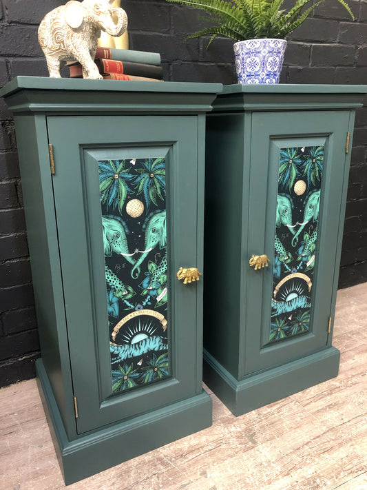 MADE TO ORDER: Pair of upcycled green bedside tables with papered fronts