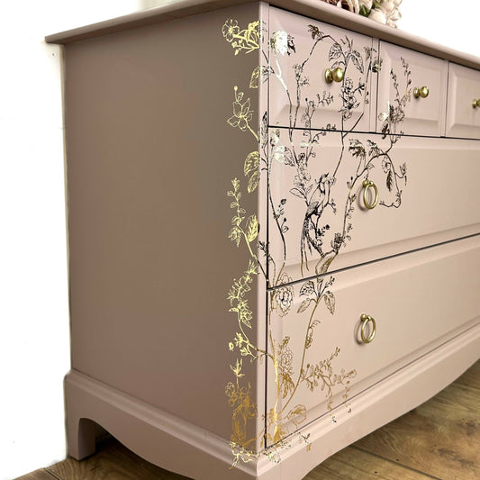 MADE TO ORDER Pretty dusky pink Stag Minstrel Chest of Drawers with gold bird song design, vintage, dresser, blossom, mcm, sideboard