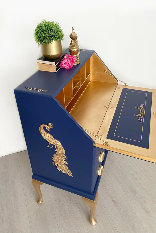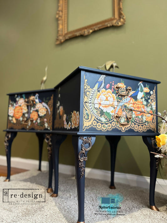 Pair of Blue French upcycled Bedside table with Pheasants and peonies design.