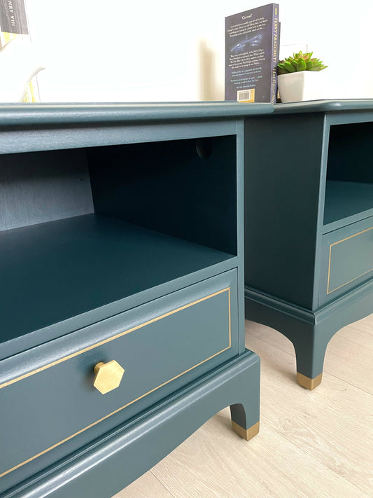 Stag Bedside Tables, spray painted Dark Green Gold bedside drawers, Stag Minstrel nightstands
