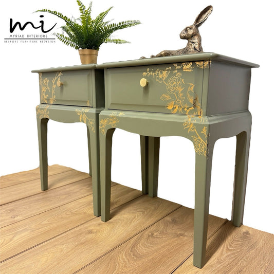 MADE TO ORDER Refurbished Stag Minstrel leggy bedside tables, green with gold floral bird design, vintage nightstands, mid century modern